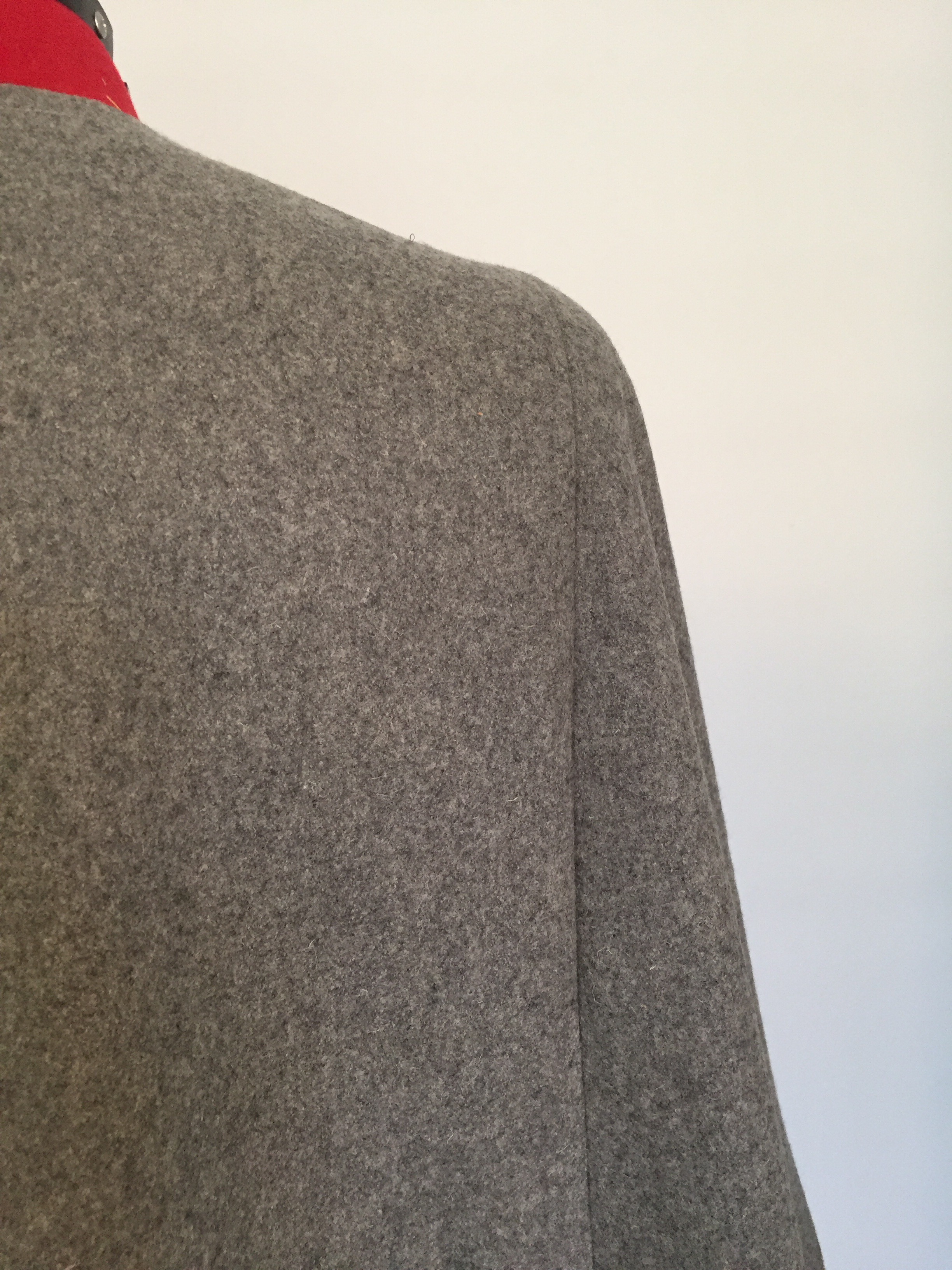 Over the past year I have purchased a few really nice pieces of fabric. There’s a wool silk blend that would be perfect for a winter dress, two cotton knits from France, a Tana lawn from Liberty, and some stunning silk. All bought and paid for and doing me no good sitting folded in a plastic box in my closet. So Saturday night, after debating over patterns for probably a month, I held my breath and put scissors to a grey pure virgin wool coating I purchased in Calgary last August and I began to make my cape. Sunday I steamed and clapped the front seams and I marveled at the beauty of quality fabric. The design is simple, but I think it will be beautiful once it’s fitted and finished properly.