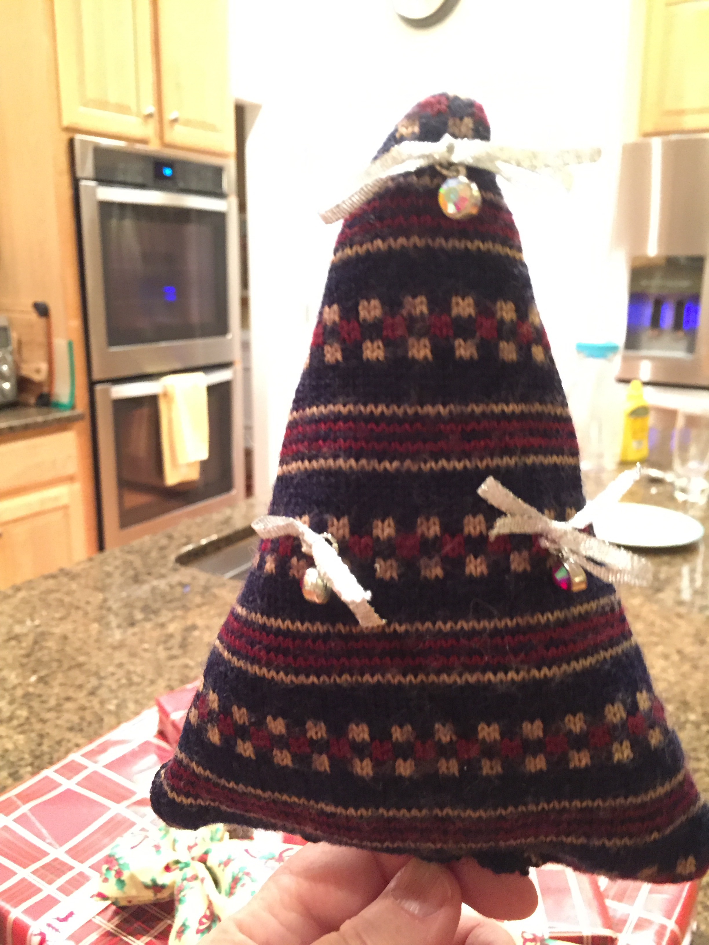 I visited my local Goodwill store and found a bunch of sweaters that would have been perfect, and wound up with a sweater-set in some kind of synthetic, and a traditional crew neck pullover in a really nice wool. $9.21 total cost for the three pieces. I told one of the clerks what I was doing with the sweaters and she was horrified that I was destroying a perfectly good garment. In retrospect, one could make about 4 trees from one of these sweaters and sell them at a craft fair for probably $15 each. Now I’m thinking of next November’s craft fairs … hmmmmm