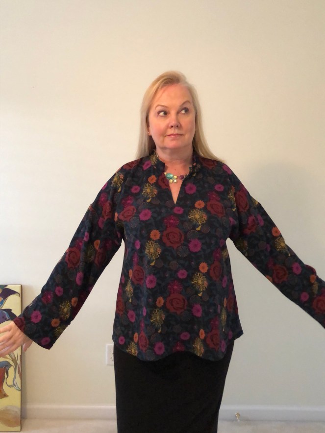 I cut a size Large which is plenty big! Had I selected based on my bust size (an XL) I would have been swimming in this! Stitching it up was simple except for two things: the fabric shrunk when I applied the fusible interfacing, and there is a pattern error – an omission in the pattern instructions. Nowhere do they tell you how to actually join the two cuff pieces (cuff and cuff facing) so I just proceeded as I usually do: