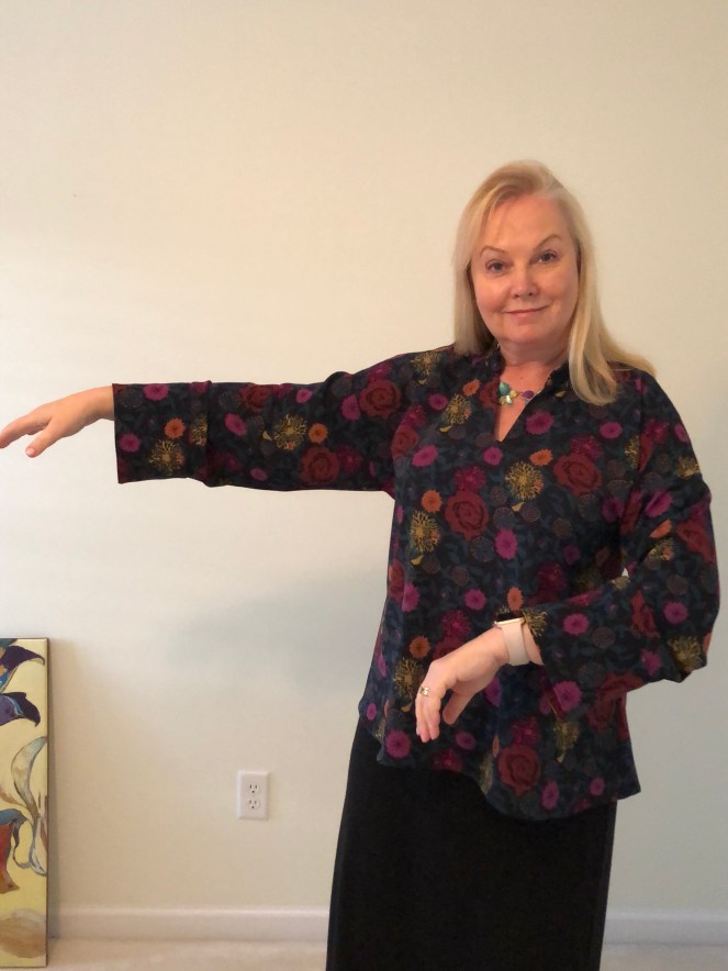 The conclusion? I like this top, especially because of the fabric used. The crepe drapes beautifully so the top hangs really nicely from the shoulders. There is a bit of creasing at the armscye but I suspect this is what happens with this style of sleeve. If I make this again I will shorten the sleeves about 3/4″, and I will also slim the sleeves because they’re quite voluminous.!