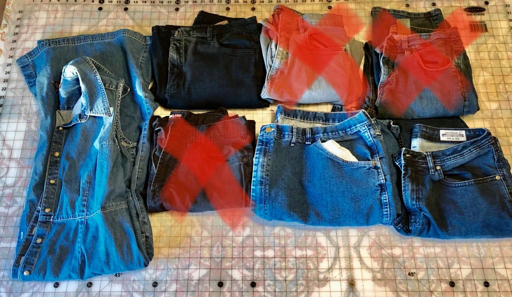 I convinced my husband to give up a couple of pairs of jeans but everything else came from the local Goodwill where I managed to find a calf-length denim dress, a pair of ladies jeans in stretch black denim and a pair of men’s jeans in size 48. The denim below is what I started with. I didn’t use the garments that are marked with red X’s.