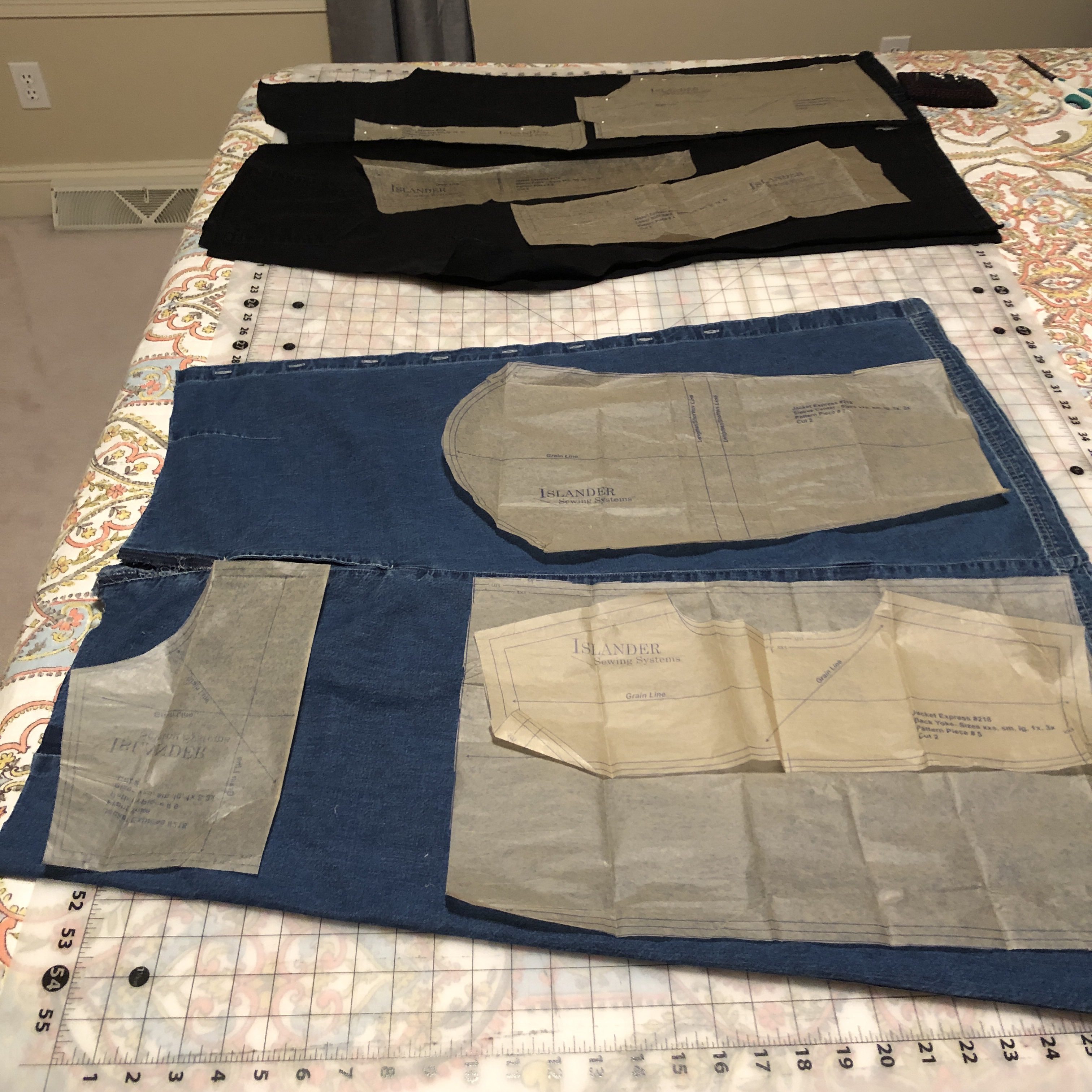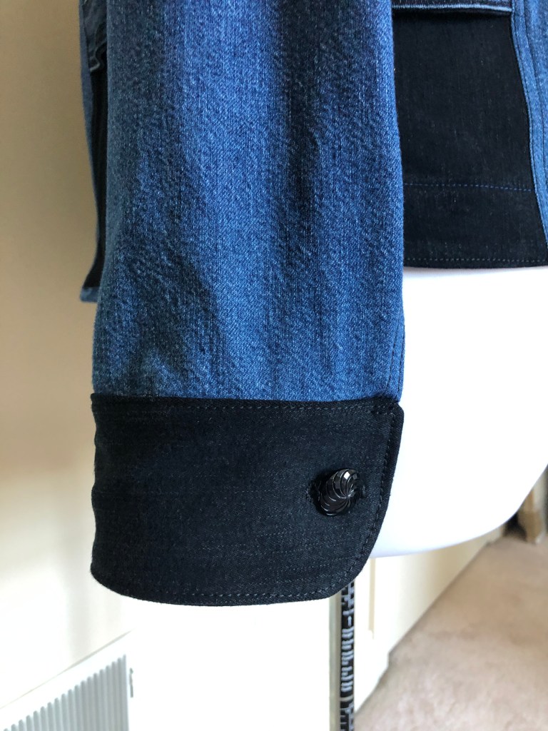 For about an eighth of a second I considered spending time picking out the leg seams but I had enough denim so why bother. Then I set about laying out the pattern pieces so the colours would look okay. The black jeans provided just enough for the front and back side panels, the inside panel of the sleeves and the cuffs. Black is slimming, right? 🤣