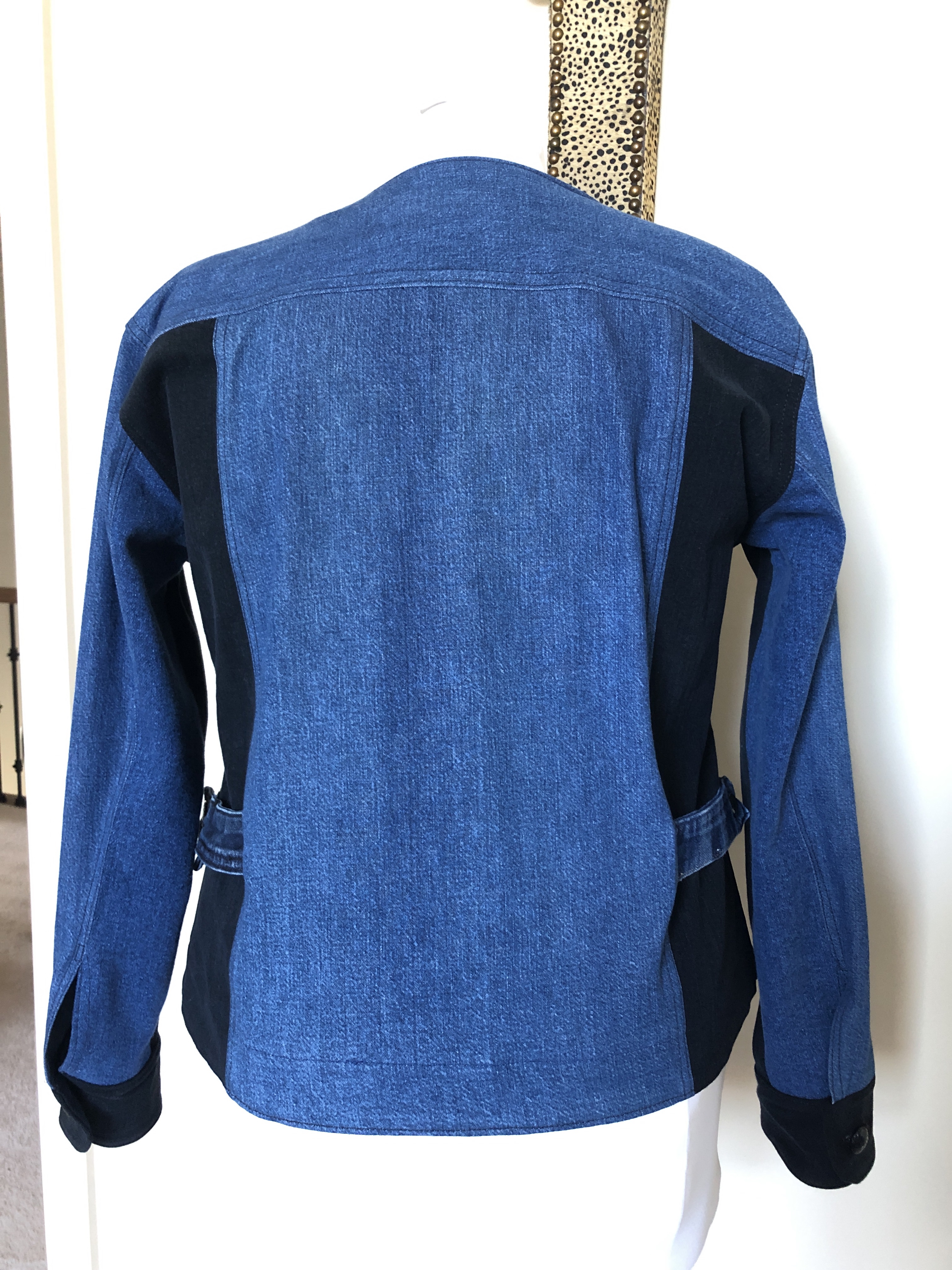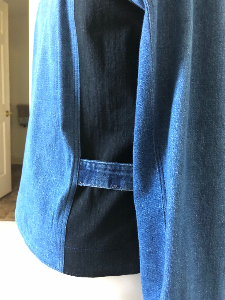 This wasn’t supposed to look like a standard jean jacket so I added straps at the waist – you know, the kind that you can tighten up when you’re smaller and loosen up when your waist expands? I just unpicked two jeans waistbands and stitched them at the side panels. I like the look and at some point I can add another button hole to cinch the waist in a bit. 😉