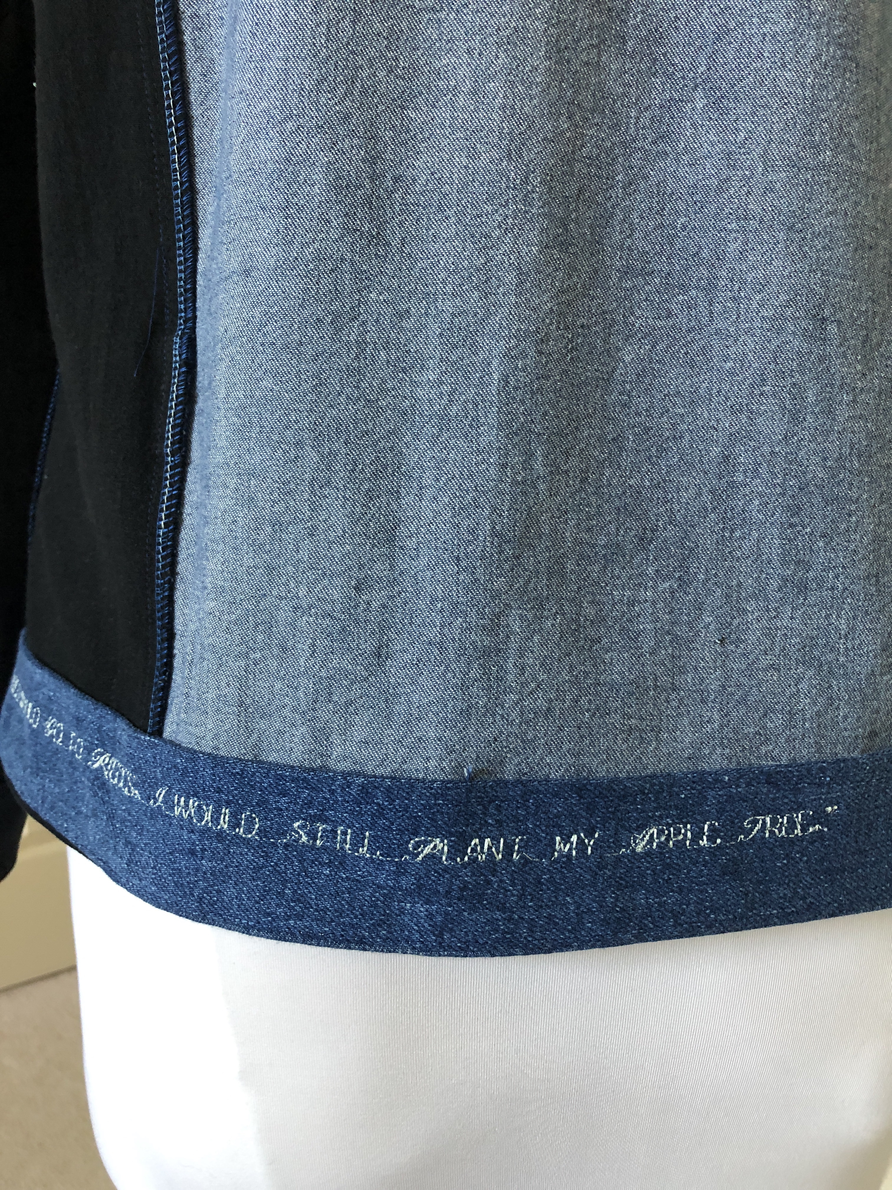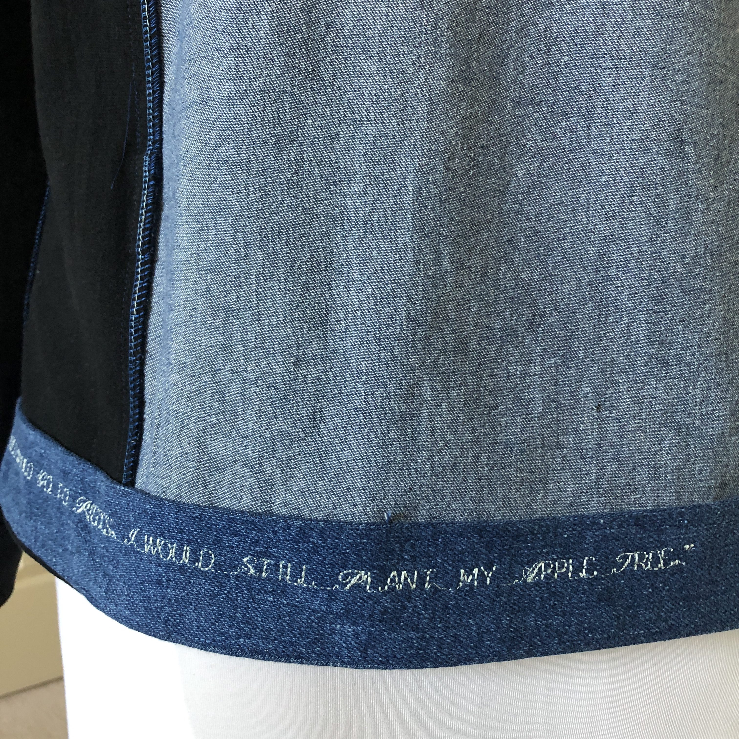 Several sewists I follow on Instagram have embroidered phrases and thoughts inside their garments so instead of putting a design on the outside, I used the lettering feature on my Brother PS500 and stitched a quote on the inside of the hem facing. For everyone this has been a really hard year and I wanted something quiet that would reinforce my optimism every time I put on the jacket.