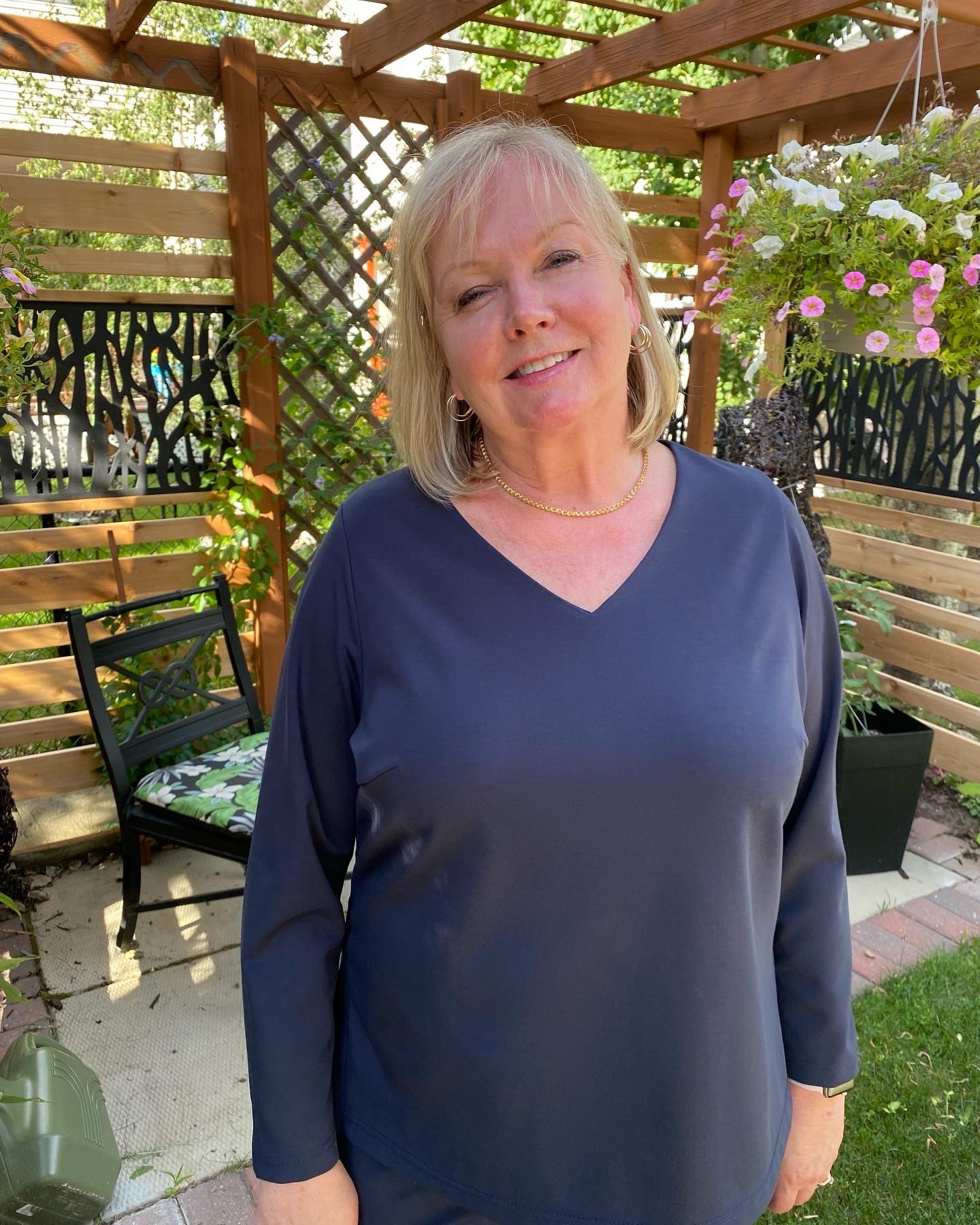 Edit on September 30, 2022: I wore this top plus the pants made of the same fabric on an overnight flight to the U.K. and the fabric looked as good when I landed as it did in the morning. This Ponte would be wonderful for a travel wardrobe. I like it so much that I just bought another piece in plum 💜