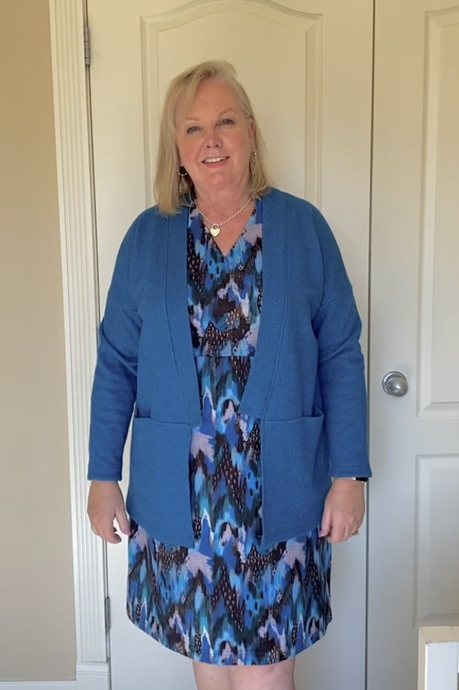 Pamela’s Patterns Softly Pleated Dress & StyleArc Coral Cardigan
