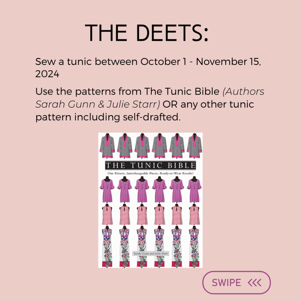 Sew a tunic using any pattern (The Tunic Bible, commercial patterns, free patterns, self-drafted pattern) between October 1 and November 15, 2024. As there are no prizes, there really isn’t a deadline. The ultimate goal is to: